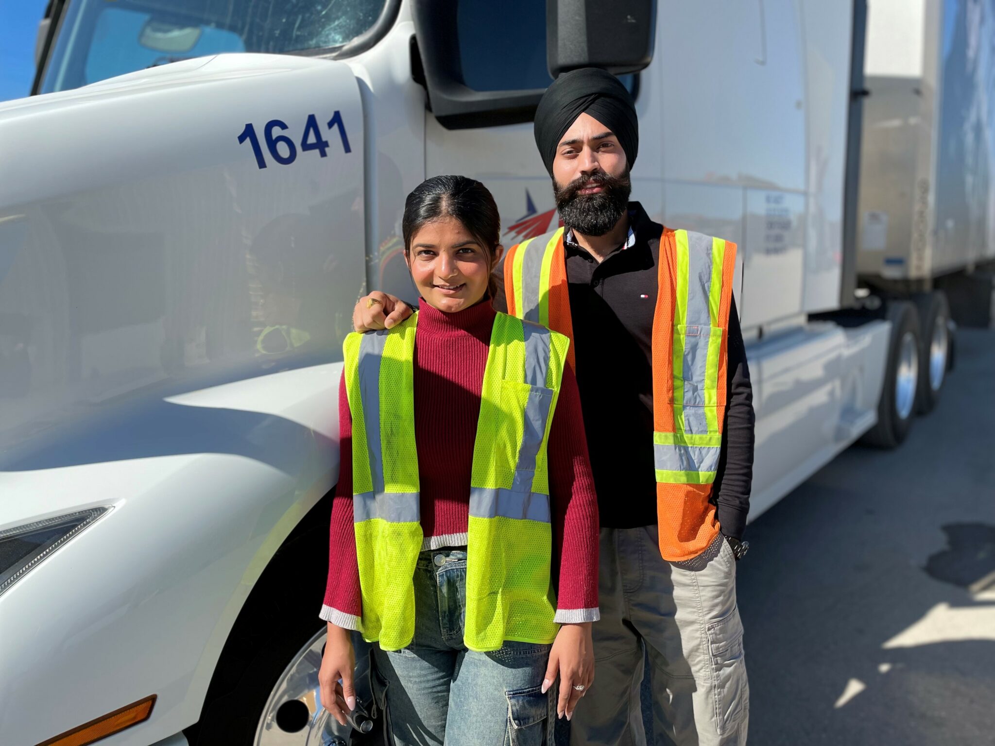 Keen to drive as a team, Riya said most couples who drive together haul van freight, but they wanted something different and more challenging. They found work as flatbed drivers. The company that hired them provided training on load securement and tarping.
